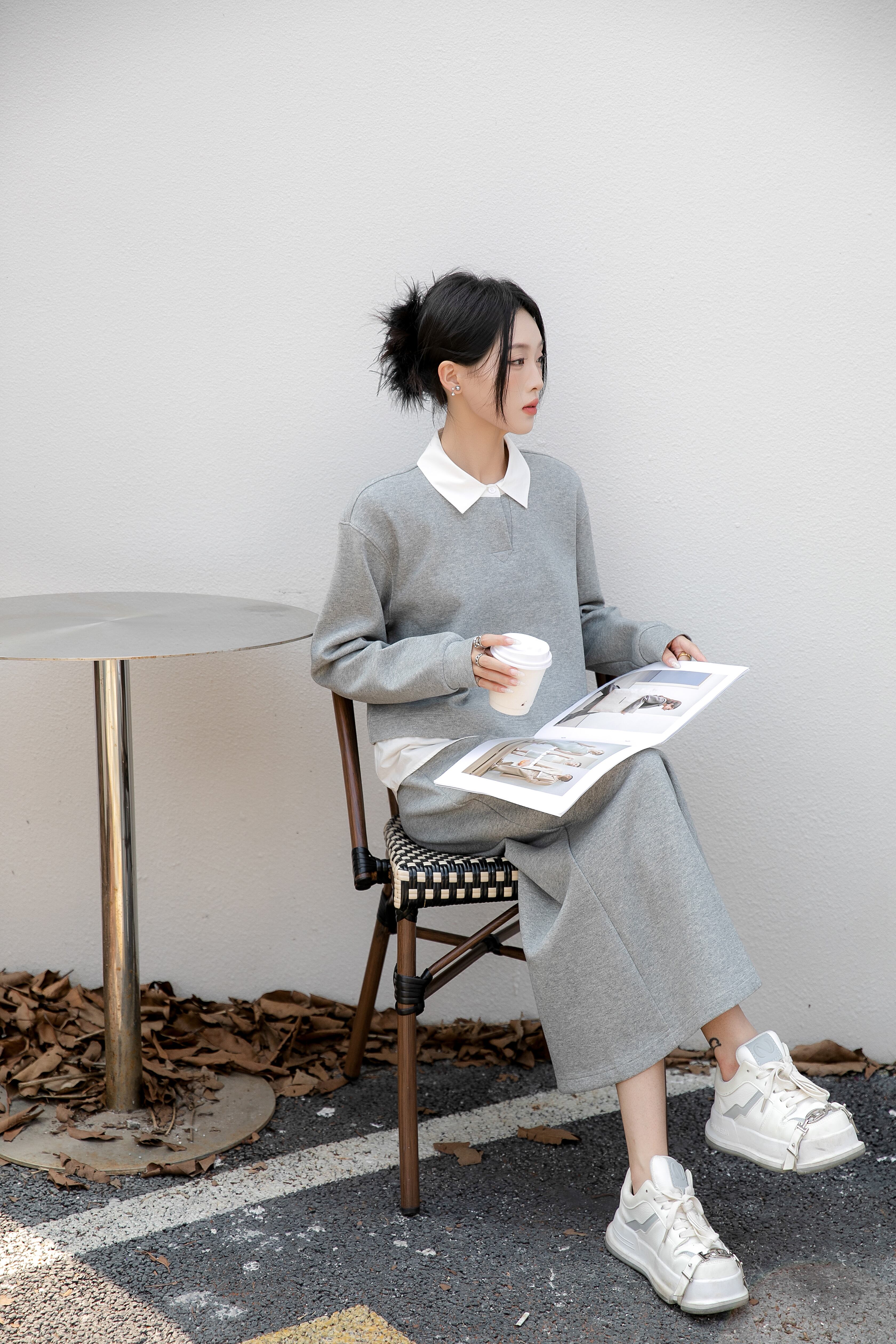スウェットトップスにシャツの裾をドッキングしたようなレイヤードデザインで、これ1枚でコーディネートが完成。
