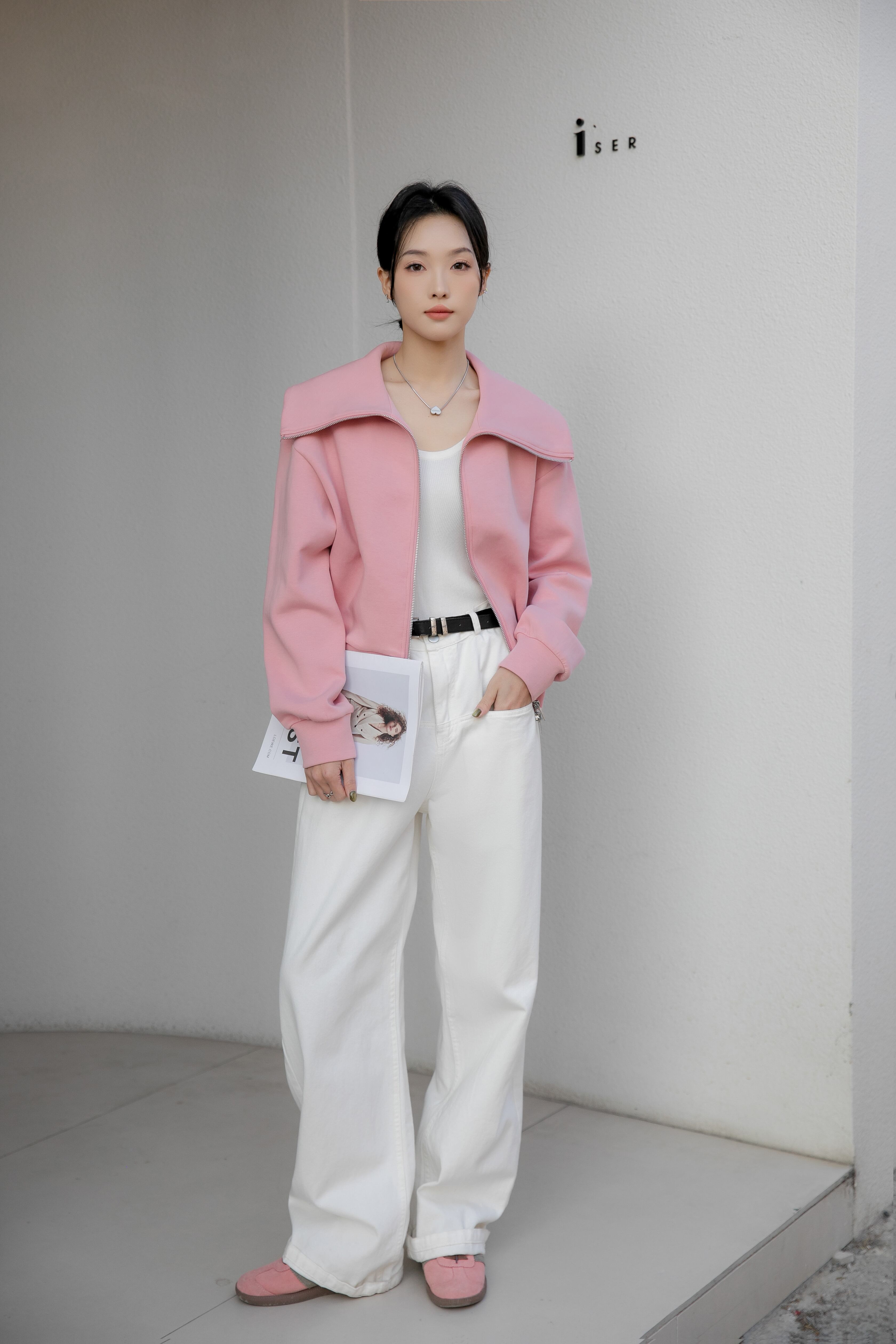 トレンドのセーラー襟とスタンドネックを組み合わせたユニークなデザインが目を引くジップアップパーカー。