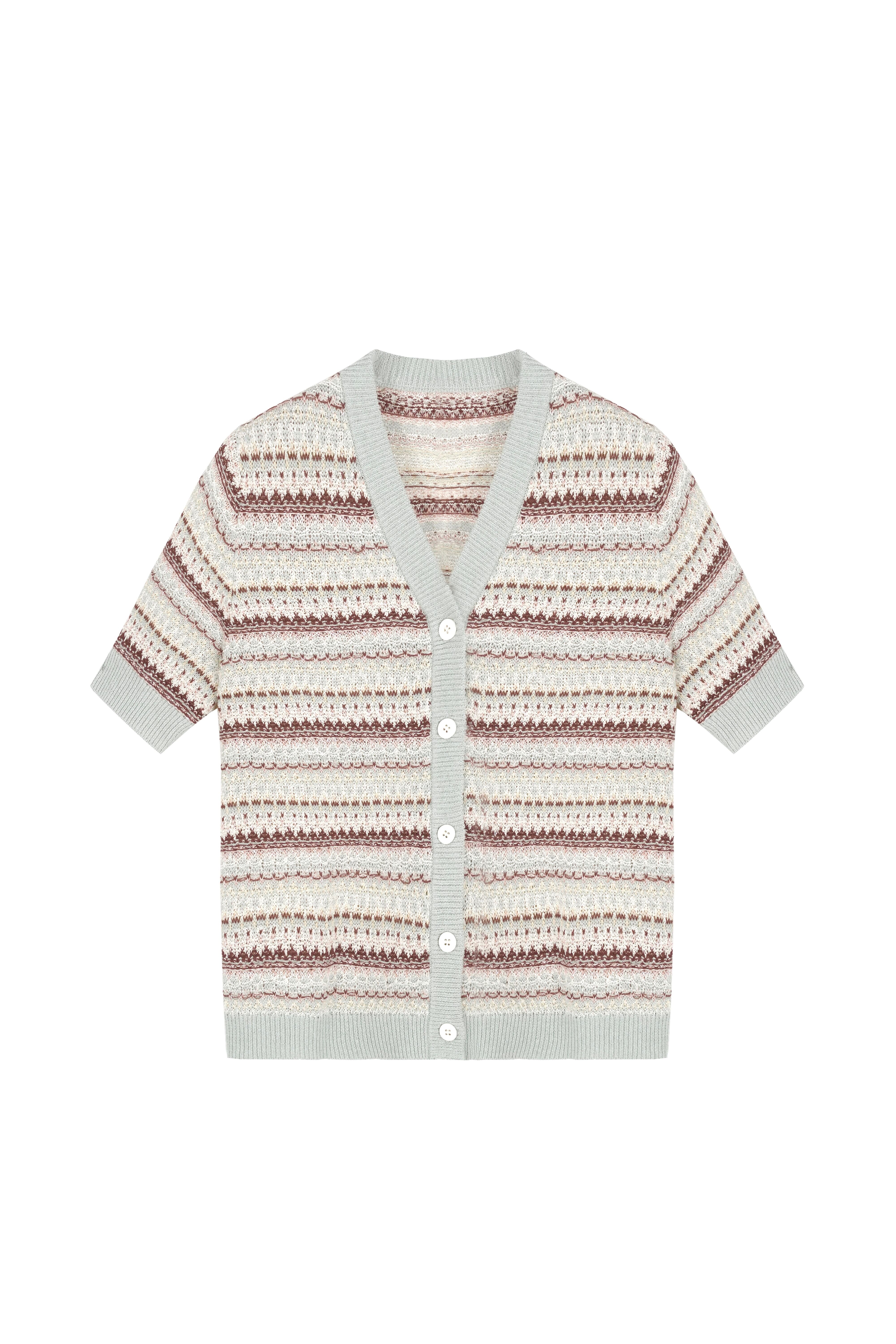 トレンド感のあるボーダー柄とVネックデザインが魅力の半袖ニットトップス。